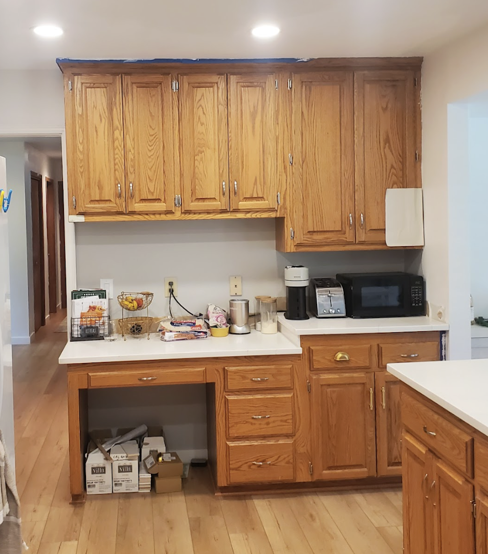 Old Red oak cabinetry with open desk space that wasn’t being used effectively.