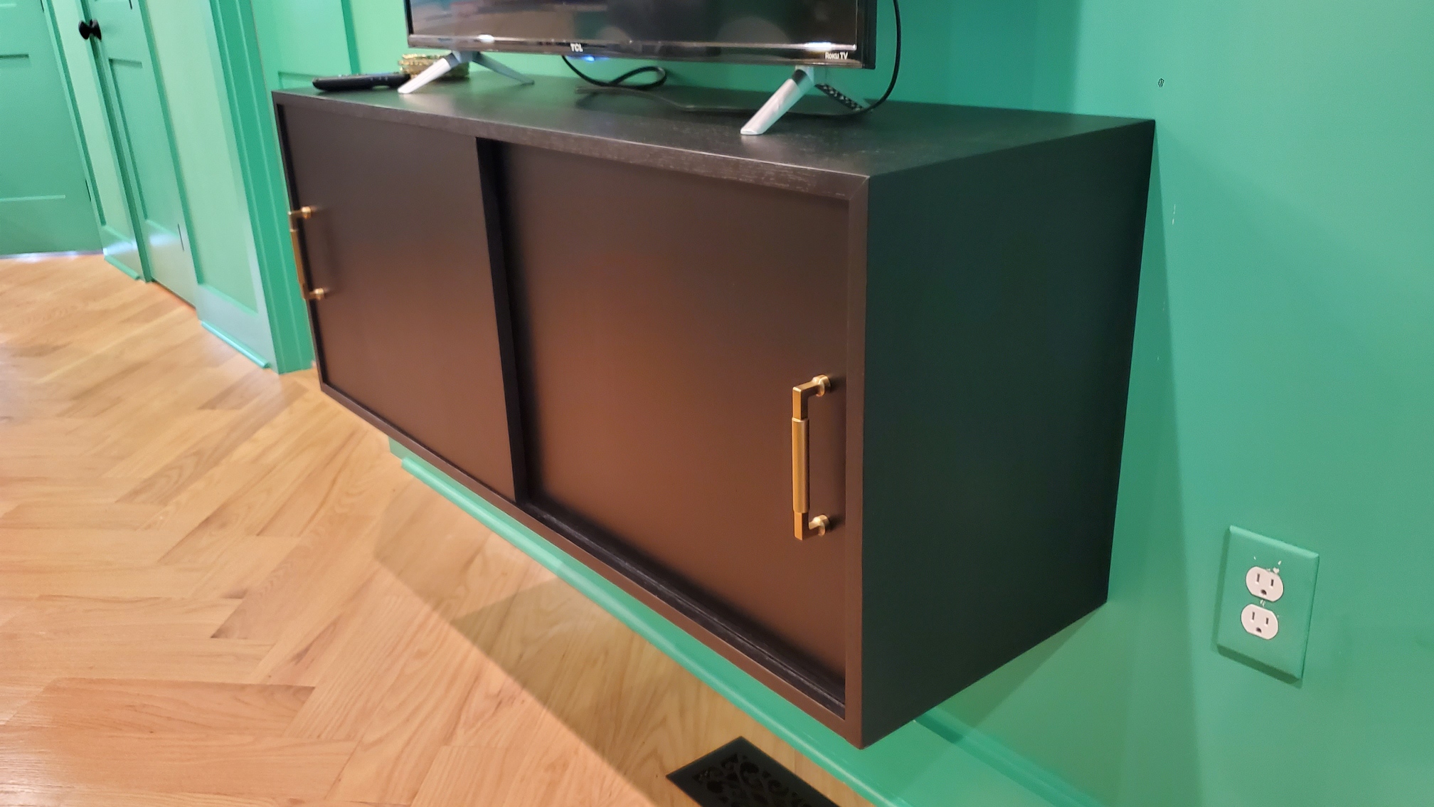 In this built-in, the interior sides are open shelving to enable functionality for electronics (ability to direct remote at streaming device, etc) while enclosing the rest of the cabinets for a sleek look that provides both storage and a countertop for sculpture & art display