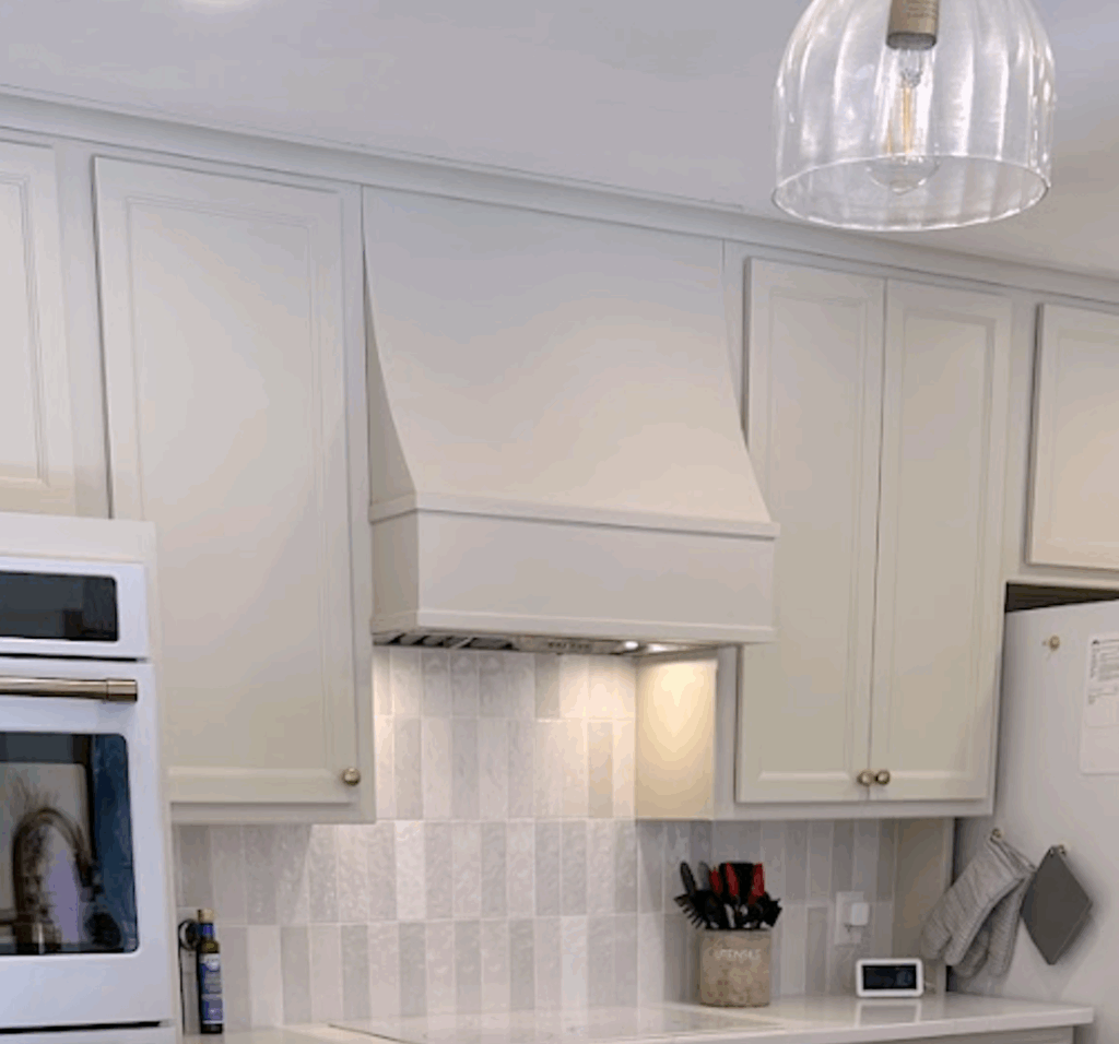 Shaker style Wood hood in Benjamin Moore “White Dove” match